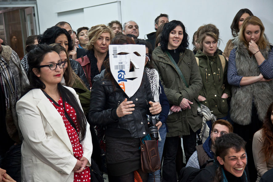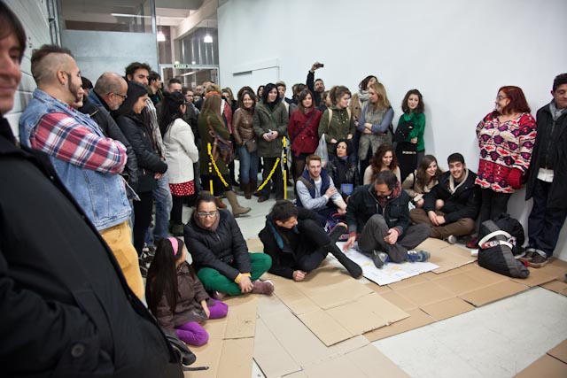 Esta acción estaba pensada para poder ser repetida. Se trataba de experimentar y estar atento a cómo las diferentes circunstancias externas modelaban un mismo concepto formal y una estructura y contenido similares. Las variaciones principales se dieron por las características del espacio físico (pequeño y con salida directa a la calle en el primer caso, de mayor tamaño y con pasillo para la salida en el segundo); por el contexto funcional (más cargado de connotaciones «oficiales» en el realizado en el Centro Párraga de Murcia); por el tiempo (la necesidad de esperar al discurso de Rajoy, que se retrasó, duplicó en Madrid la duración prevista). Como resultado de estas diferencias, la performance de Madrid resultó más concentrada espacialmente y se extendió en el tiempo hasta convertirse casi en una acción de resistencia. La de Murcia, en la que no era necesario esperar el discurso, resultó ajustada a su duración prevista y, espacialmente, terminó por adoptar una forma lineal.