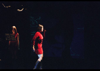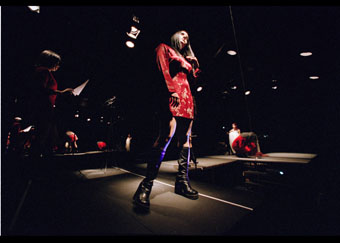 Inicio con una descripción del dispositivo con el cual uno se encontraba en el teatro. En los extremos del espacio donde se desarrolla la puesta en escena se ubicaban dos espejos encontrados uno con otro. En medio de los dos espejos y paralela a ellos, en el centro del espacio una plataforma a la manera de las pasarelas de modelaje. Y finalmente, entre la plataforma y los espejos se encuentran de cara a estos últimos los espectadores, dando su espalda tanto al escenario como al resto del público. En primer instancia la construcción lúdica del espacio nos ofrece una peligrosa disposición dual a la mirada del espectador: por un lado, el límite se hace presente al tener detrás el lugar de la acción, al no poder acceder al movimiento en un solo sentido; al mismo tiempo nos ofrece una oportunidad de visión amplia y profunda gracias a los espejos, donde alcanzamos a percibir los signos de una manera total a través de sus fragmentos. La lectura se vuelve infinita. Entrados en esta paradoja se pone en riesgo la participación del espectador; accede o no al juego. El juego que abre la disposición de los espejos nos ofrece uno de los aspectos temáticos de mayor complejidad que ofrece el montaje en relación con la serie de referencias icónicas a través de las cuales se construye el sistema de imágenes propios de la puesta, y a la cual haré referencia más adelante. Sin embargo, la calidad intertextual inherente a todo ‘ensemble’ semiótico contiene diálogos establecidos entre el sistema de signos (subtexto de la obra) de cierta teatralidad, con otros signos de distintas naturalezas (sujetividades sígnicas, signos objetuales, entre otros). Estos diálogos generan un cuerpo textual (organismo semiótico) unido a través de la frontera que liga los diversos signos participantes del acto teatral, y que tiene como finalidad última el contacto e intercambio con el espactador como organismo opuesto al universo de la obra (la acción de entretejer deviene nuevo texto orgánico).