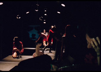 La fábula ha funcionado a lo largo del desarrollo teatral gracias a las observaciones aristotélicas y a las interpretaciones -como principios inamovibles- que de esta se han hecho desde el medioevo como parte fundamental del drama. Por mucho siglos la teatralidad ha permanecido estrechamente ligada a la idea de tres unidades y a la dependencia del personaje como único elemento motor dentro de la estructura formal del drama. Así, las posibilidades de acción teatral se mantenían atadas y limitadas al campo de la acción dramática. Su libertad de movimiento se había restringido por la jerarquía ya consolidada de las ‘partes’ del drama. Y aunque existieron alternativas de modificar el orden impuesto por los supuestos preceptos aristotélicos, la fábula siguió rigiendo la construcción del drama. Digamos que la fábula fue (¿o es?) control y organizador del resto del cuerpo del cual forma parte: ‘la cabeza’ que estructura ‘lo demás’ desde un esquema teológico descrito por Derrida a partir de la poética artaudiana. Lógica de lo vertical, de lo erecto, de lo fálico masculinista. Lógica vigilante del régimen de poder que perpetúa esta misma lógica. Así, durante el acontecimiento escénico de ‘Salomé’ el tema recurrente será la cabeza de Iokanán. Sin embargo, desde el texto de Oscar Wilde, la cabeza deja de representar el orden vertical, para convertirse en algo roto, engullido por otro poder, por otra fueza que lo enfrenta y lo derrota. Como leit motiv nos vamos encontrando signos que recurrentemente nos recuerdan el acto de la decapitación (Ej. La bandeja plateada, las gotas rojas que escurren del helado, el video de la mantis religiosa). Así como el cuerpo de Iokanán se fragmenta al separar la cabeza de su totalidad, a través del corpus escénico vamos siendo testigos del carácter fragmentario que configura la imagen de Salomé. El cuerpo de Salomé se reparte entre varios cuerpos que según el texto que cada cuerpo quiere representar, proyecta signos que conducen a distintas lecturas posibles. Aunque en principio estos signos aparecen por separado, pertenecen a una colectividad, a un organismo. Es la colectividad la que hará que los cuerpos donde se deposita Salomé vayan creando una polifonía semiótica que tenderá puentes con el espectador. Es en este aspecto donde se inicia la configuración de la cabeza separada, cortada. El hecho de que Salomé se encuentre repartida y no podamos asirla en una sola presencia nos aleja del sentido monolítico que tiene la fábula como cabeza que ‘controla y organiza’. Aquí no hay fábula. Lo que vemos es la construcción paradigmática escrito en el cuerpo de la acción, del movimiento que se genera a partir de las mujeres que habitan el espacio. Entonces no es la cabeza lo que aparece, sino el cuerpo sin cabeza. Extendiendo el análisis crítico a la propuesta de juego actoral que realizan las actrices cabría abrir espacio para estas preguntas: ¿De qué manera se aborda la actoralidad? ¿Qué es lo que exige esta forma de teatralidad? ¿Acaso cabe aquí hablar de mimesis? ¿En dónde, cómo y cuando se configura? ¿Se rompe, se expande o sólo se esconde?